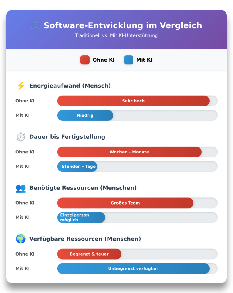 Nicht nur die Dauer für die Fertigstellung von Programmen sinkt rapide. Wichtig ist auch, dass der Energieaufwand des Menschen ganz erheblich reduziert wird. Es ist eben viel leichter, eine sehr einfache Tätigkeit auszuführen als eine Tätigkeit, bei der Sie intellektuell stark beansprucht werden. Viele scheitern schon daran, dass sie mit anspruchsvollen Aufgaben gar nicht erst anfangen. Mit der KI-Programmierung fällt diese Hürde komplett weg.