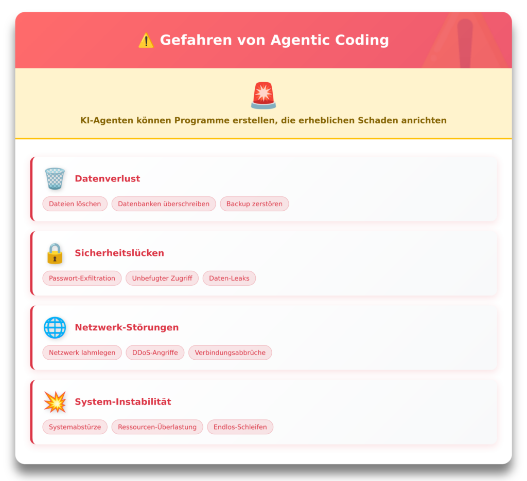 Zusätzlich existieren erhebliche Gefahren beim Einsatz von KI-Agenten. Beispielsweise kann der Agent ein Programm erstellen, das Schaden anrichtet (Dateien löschen, Netzwerke lahmlegen, Passwörter exfiltrieren, Abstürze des Systems verursachen usw.). Weniger leicht entdeckt werden Programme, die falsch arbeiten. Bei einer Rechnungswesen-KI wäre es besser, wenn alle Zahlen stimmen. 99 % reichen hier nicht aus. Jeder weiß, was es bedeutet, eine 9 statt einer 1 vor dem Komma zu haben oder das Komma um eins weiter nach rechts oder links rutschen zu lassen.