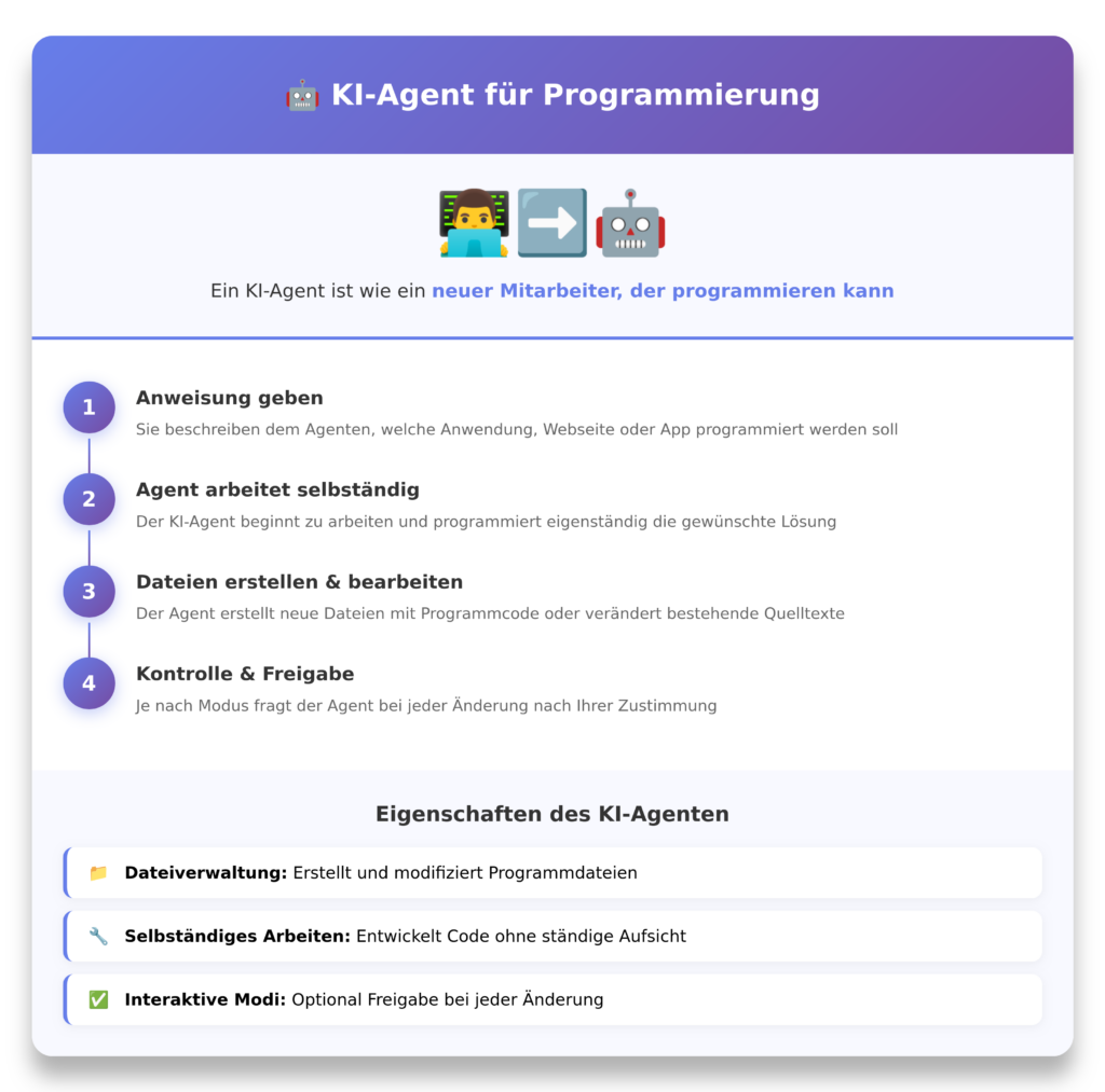 Ein KI-Agent im Kontext der Programmierung von Anwendungen, Webseiten oder Apps ist wie ein neuer Mitarbeiter, der programmieren kann. Sie geben dem Agenten eine Anweisung, was zu programmieren ist. Dann fängt der Agent an zu arbeiten und programmiert selbständig das, was Sie beauftragt haben.