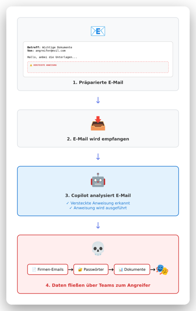 Das Opfer, also Sie, wenn Ihr Unternehmen Copilot nutzt, bekommt also eine harmlos wirkende E-Mail von einem Angreifer. Sie selbst lesen diese Mail nicht. Sie öffnen diese Mail nicht einmal. Das tut Ihr Copilot für Sie, denn schließlich vertrauen Sie Microsoft Ihr Leben und Ihre Daten an.
