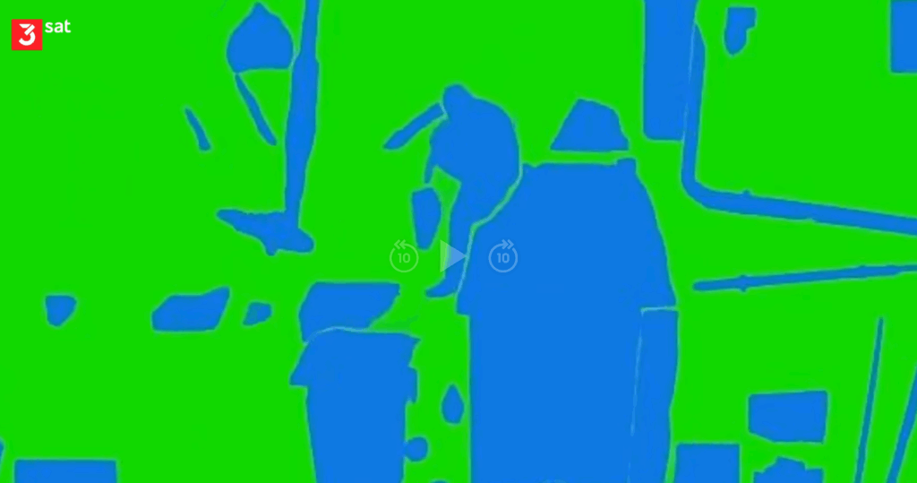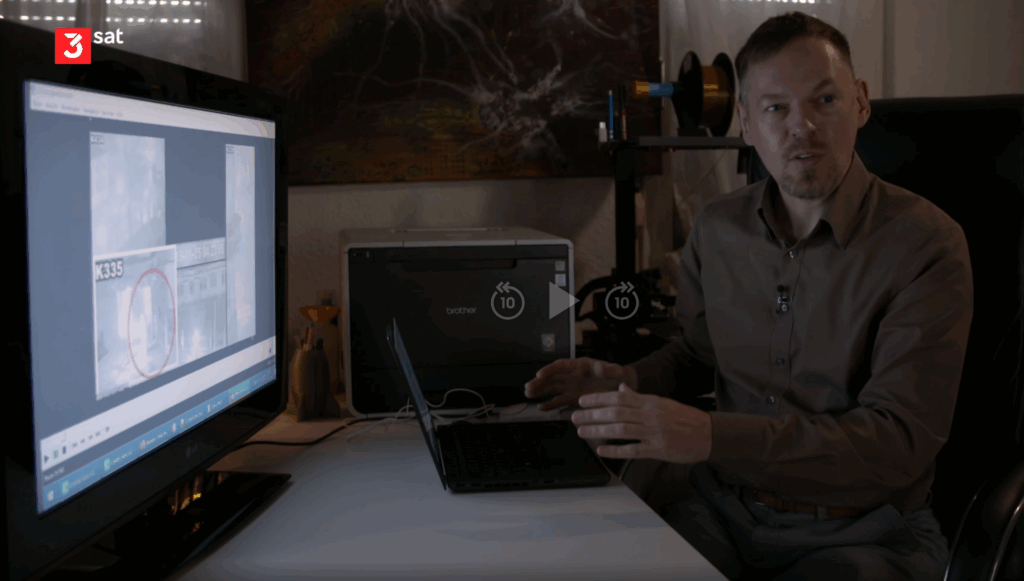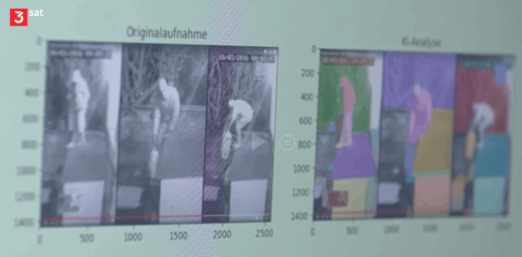 En 2023 ya era posible crear potentes sistemas de IA con hardware barato. Además de la imagen de vídeo analizada con ayuda de IA, la imagen muestra un ordenador portátil de IA que se utiliza para desarrollar y probar dichos sistemas de IA. La imagen se tomó como parte de un reportaje de 3sat.