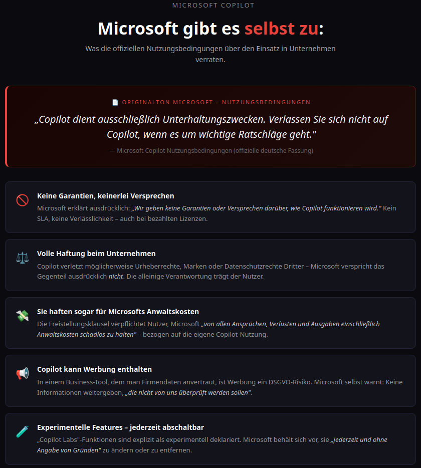 Es ist nicht Kritik von außen, die Copilot in Frage stellt – es sind Microsofts eigene Nutzungsbedingungen. Wer als Unternehmen Copilot professionell (und unter der Annahme, belastbare Ergebnisse zu erhalten) einsetzt, tut dies gegen den ausdrücklichen Willen und die rechtliche Positionierung des Herstellers.