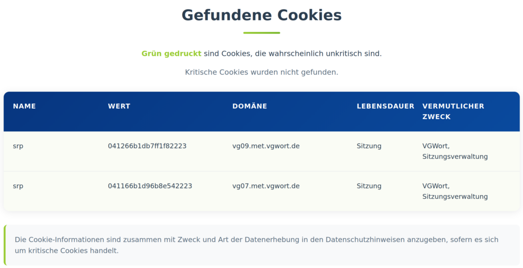Die vom Website-Check erkannten Cookies werden zusammen mit Ihrer Bedeutung, sofern diese bekannt und in der Cookie-Datenbank gespeichert ist, aufgelistet.