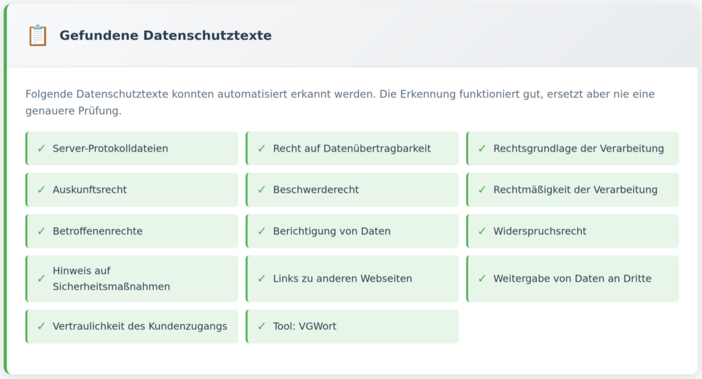 Im Bericht wird neben Details zum gefundenen (oder nicht gefundenen) SSL-Zertifikat auch ausgegeben, welche Datenschutztexte zu den erkannten Tools und Plugins als vorhanden erkannt wurden.