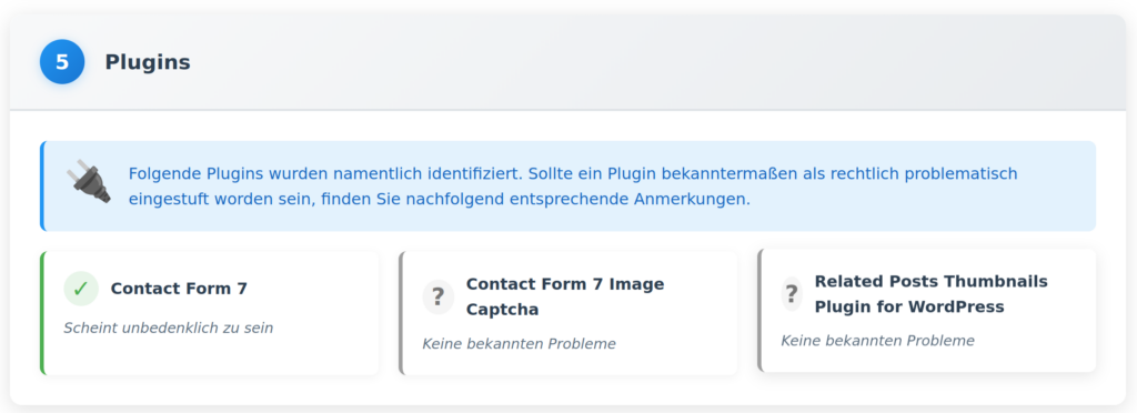 Hier beispielsweise wurden auf einer WordPress-Seite mehrere Pluging erkannt. Zu den Plugins erfolgt eine Diagnose, ob sie bedenklich oder unbedenklich sind. Die Diagnose basiert auf einer lokalen Plugin-Datenbank, auf die der Scanner zugreift.